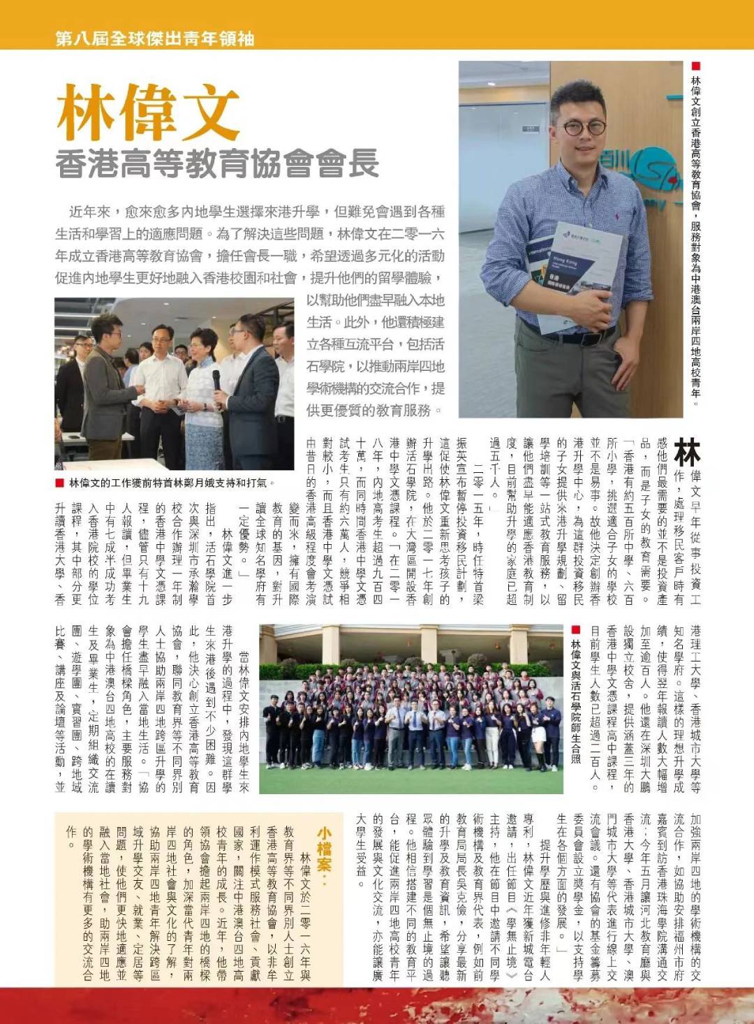 很荣幸获得第八届全球杰出青年领袖这个荣誉,感谢《亚洲周刊》,感谢支持我的评委,感谢香港高等教育协会的每一员,大家的努力成就了我。